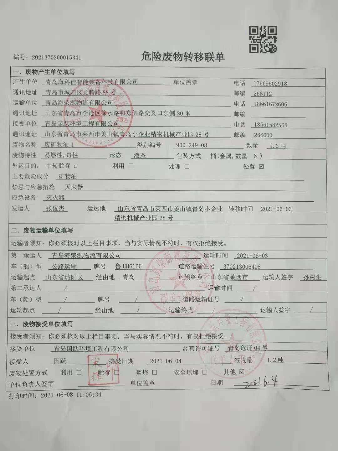 廢物運(yùn)輸單位:青島海榮源物流有限公司 運(yùn)輸時間:2021-06-03 運(yùn)輸車:汽車  牌號:魯U(kuò)H6166