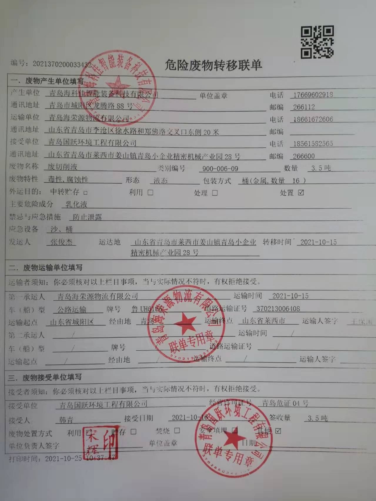 廢物運(yùn)輸單位:青島海榮源物流有限公司 運(yùn)輸時(shí)間:2021-10-15