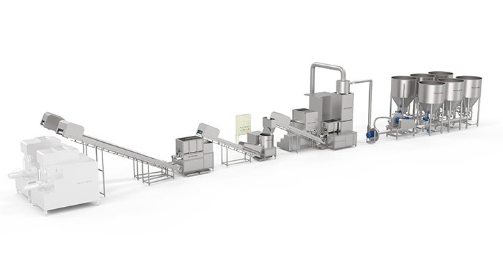 概要信息:本產線采用制熟工藝原理制造。具有成熟的配下米-洗沖濾-磨粉-儲粉配粉-和粉醒粉-擠絲成型-切塊風冷定型-老化干燥功能于一體的生產工藝,產品呈圓柱形波紋塊狀,含水量14-15%,保質期18個月。全產線自動化集成度高,適配全米、復配、雜糧不同原料的波紋米粉的生產需求,生產效率與產品穩定性俱佳,具有優良的生產操作體驗。