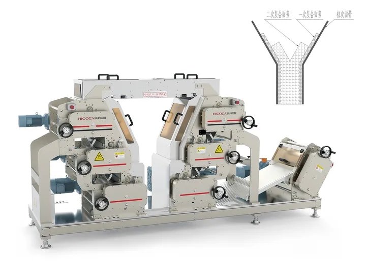 片絮復(fù)合壓延技術(shù)的靈感來源于市場上一些作坊的制作工作,他們每次在壓延出來的面帶上都會均勻撒上面絮,再進行壓延。這樣的制作工藝在市場上得到了認可。但是傳統(tǒng)做法效率慢,勞動強度大,也無法保證面條質(zhì)量能夠做到標準統(tǒng)一,更無法保證食品衛(wèi)生安全。把民間的好工藝融入到智能裝備中,實現(xiàn)安全、標準生產(chǎn),這是海科佳的出發(fā)點。