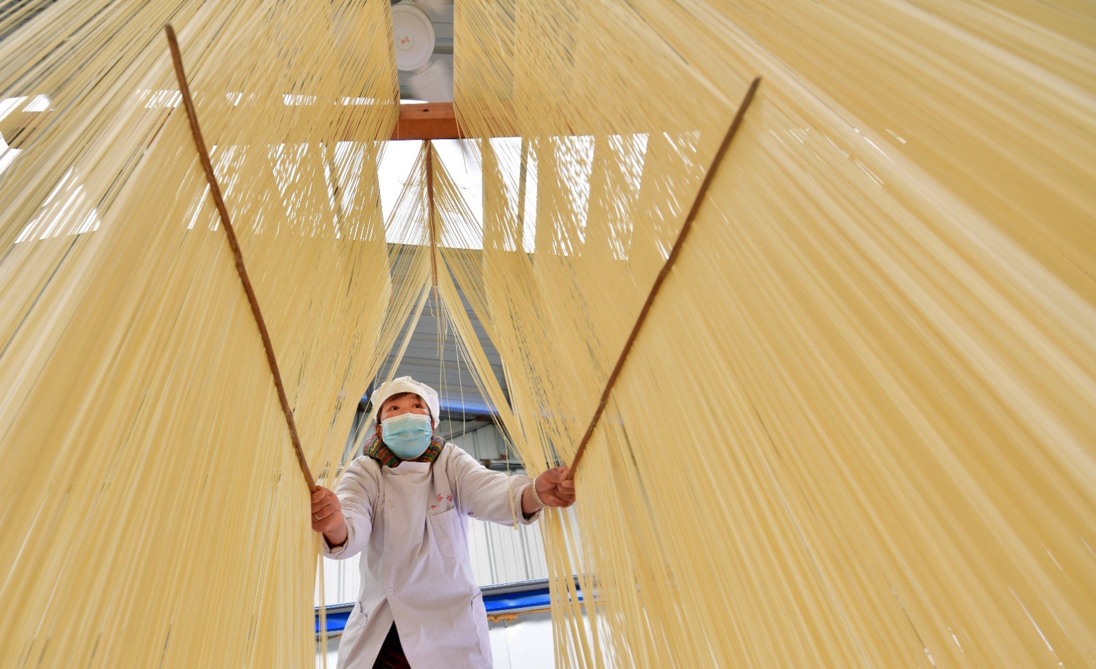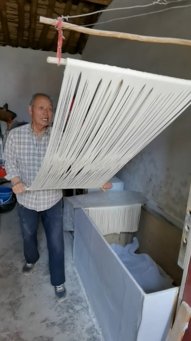 手延面經6次醒發,面筋網絡充分形成,面條經過多次旋轉,形成堅韌的面筋結構,制成面條更有韌勁。面條經多次拉伸,使淀粉均勻附著在面筋網絡的空隙中,使面條更加軟彈、爽滑。