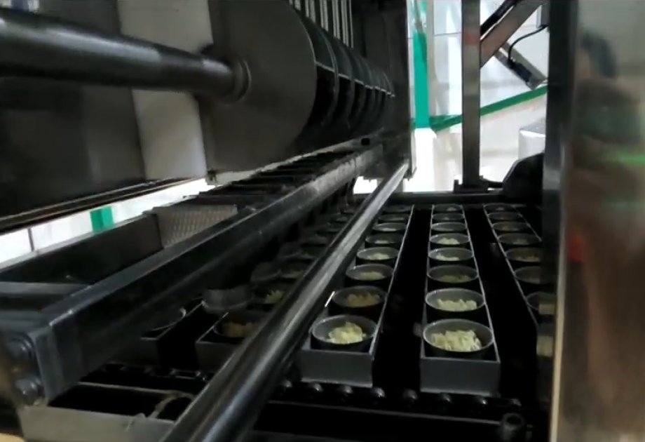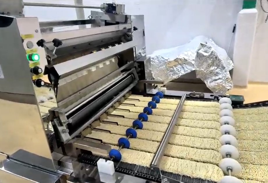 ◆將從蒸箱中送出的波紋熟面帶連續(xù)切斷入碗進(jìn)行油炸或烘干